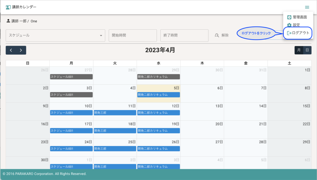 ヘッダー右のハンバーガーアイコンをクリックし、①ログアウトをクリックすると、ログアウトされ、ログイン画面が表示されます