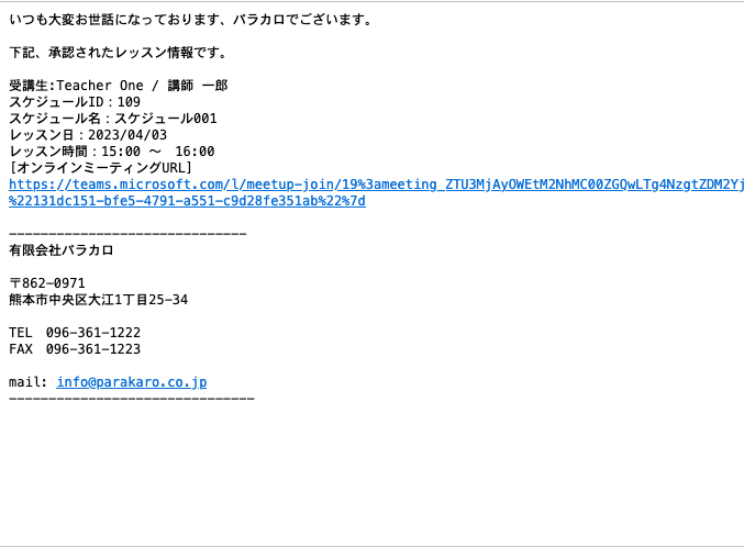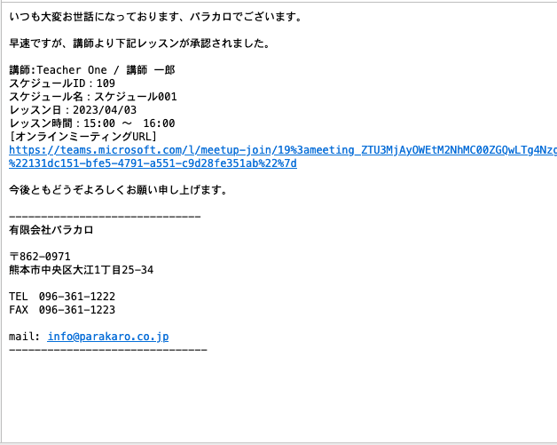 承認ボタンをクリックすることで、レッスンの承認が行われ、オンラインミーティングのURLがメールで送信されます。