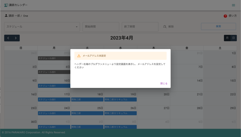 メールアドレスが未設定の場合は、レッスン選択時にメッセージが表示されます。