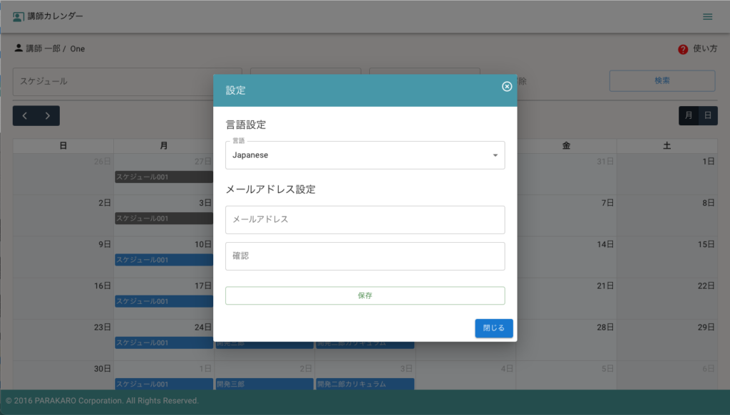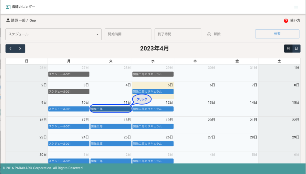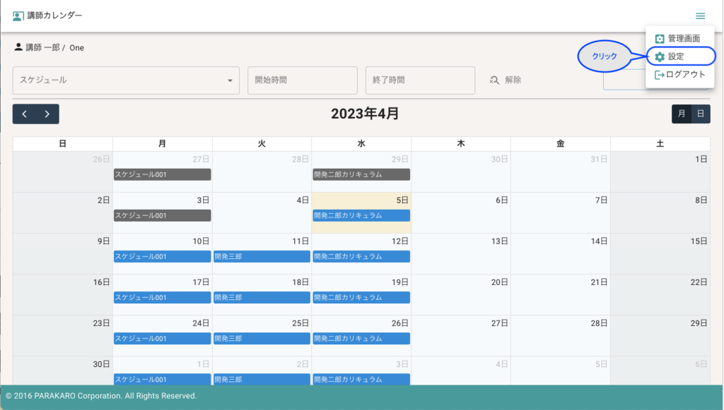講師のスケジューラー画面では、用意されたレッスンへのレッスン時間の登録・承認・キャンセル等を行うことが出来ます。