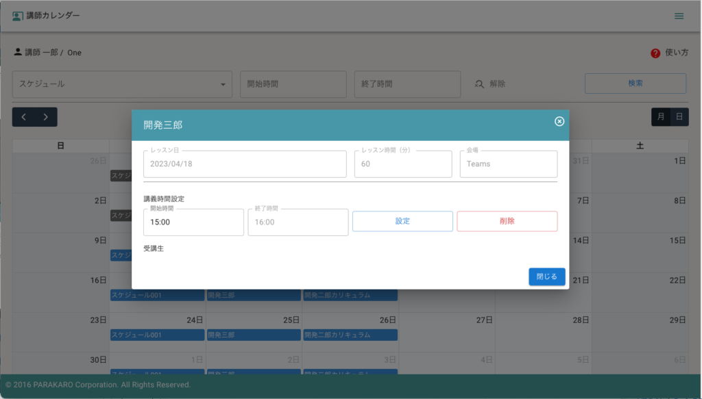 レッスン時間が設定されると、上記画面のようにレッスン内容ダイアログが表示されます。