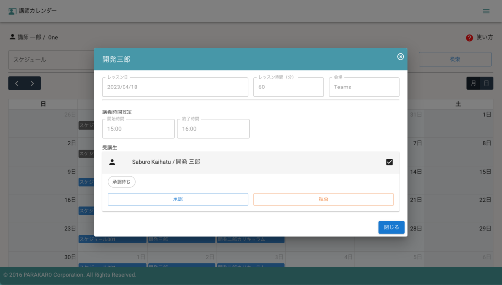 設定したレッスン時間が、承認前に何らかの理由で実施出来なくなった場合、レッスン時間の否認を行うことが出来ます