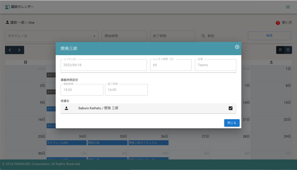 アクティブ(背景色が青)になっているレッスンをクリックすることで、レッスン内容のダイアログが開きます