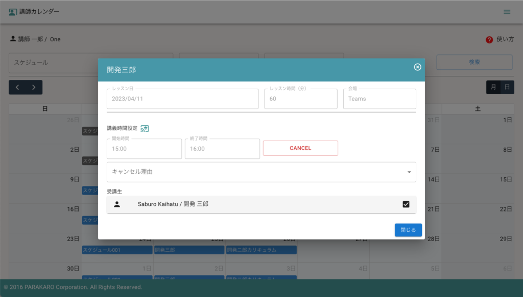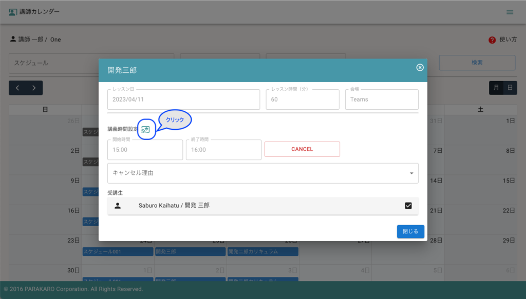 CANCELボタンをクリックすることで、レッスンのキャンセルを行うことが出来ますが、同じレッスンに講義時間を設定することは出来ません。