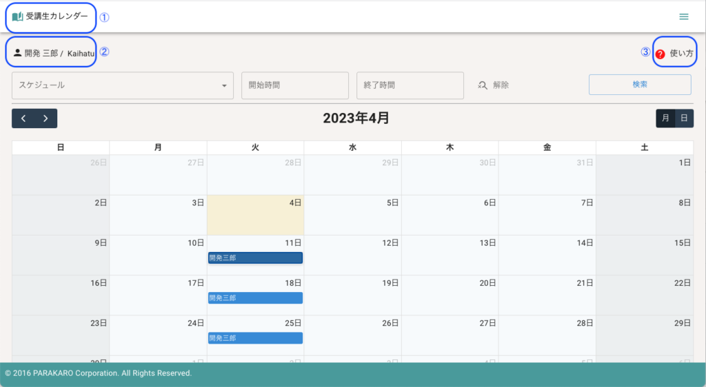| ① | 受講生の画面であることが表示されます |